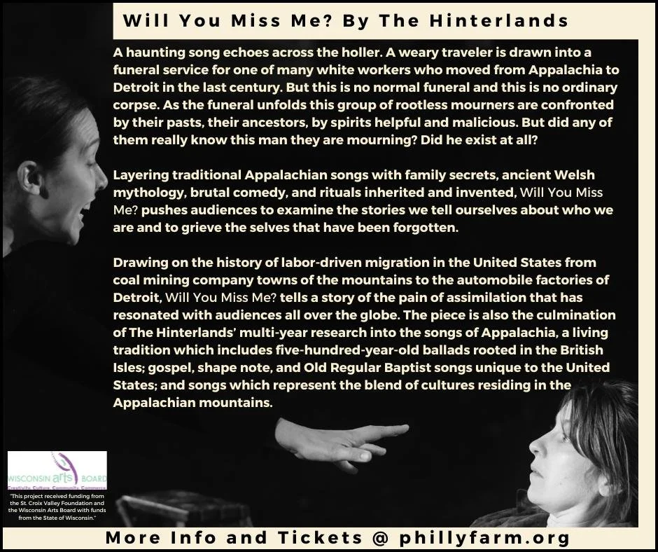 The Hinterlands return for a second run of their nationally acclaimed performance “Will You Miss Me?” If you missed it last year, now’s your chance! Tickets and info here